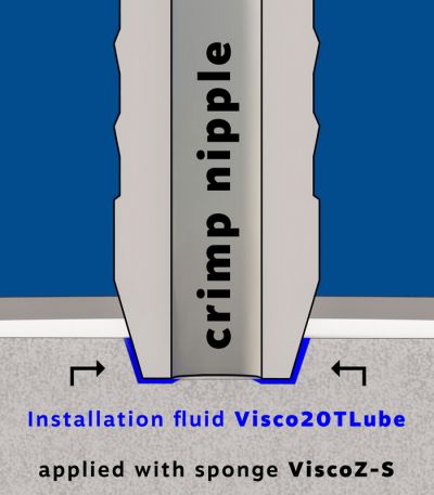 To achieve an ideal result, the crimp nipple should not be dipped directly into the Visco20TLube installation fluid. To apply a thin film on the outside of the crimp nipple, we recommend using our application aids - ViscoZ-S and ViscoZ-B. To do this, place the ViscoZ-S sponge in to the ViscoZ-B container and pour the Visco20TLube assembly fluid into the container.